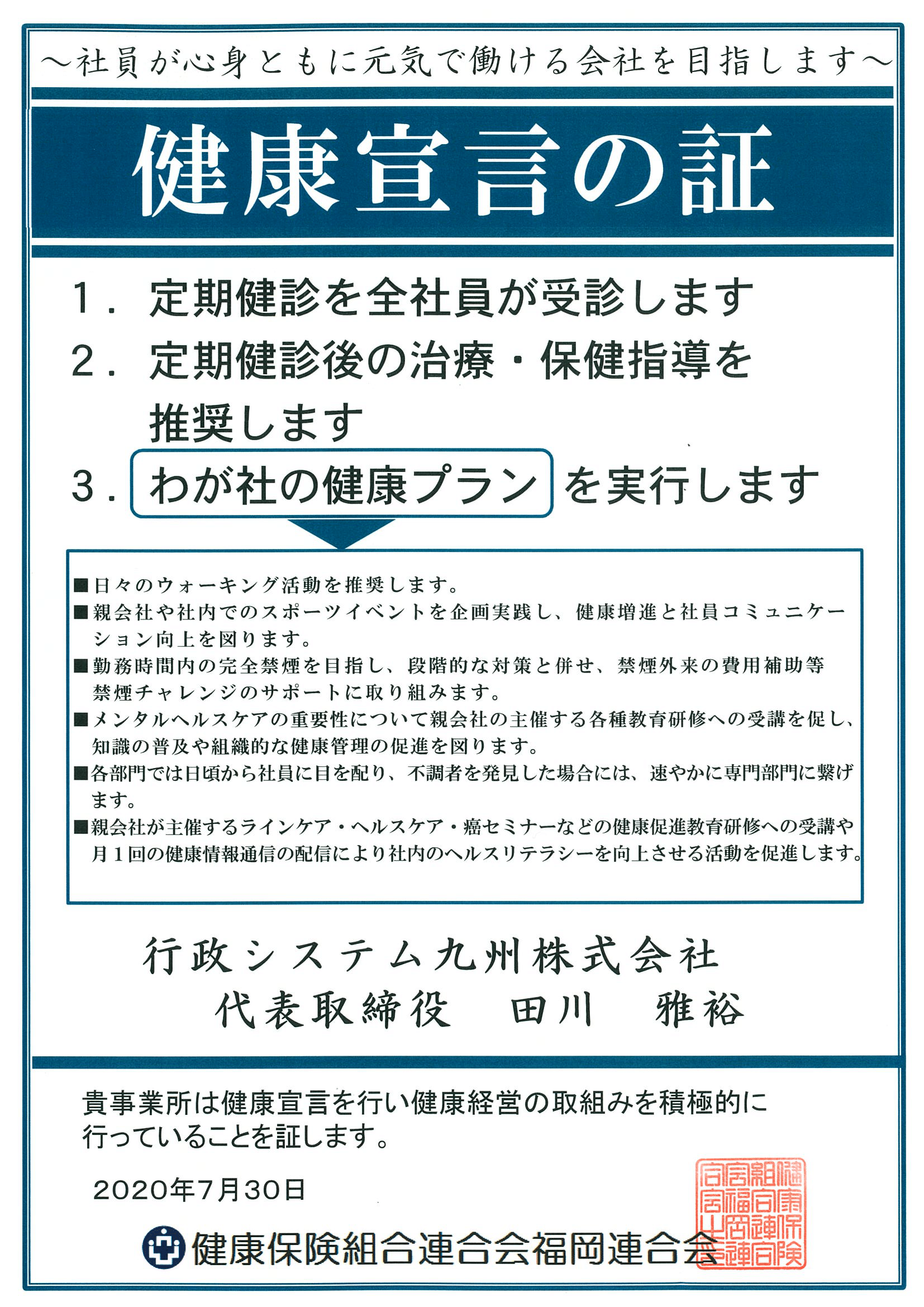 初代代表より「健康第一」の合言葉で業務運営をしてまいりましたが、健康経営という方針を打ちだし推進することで 今まで以上に、私たちの「心×体」そして「働く職場(組織)」の健康を保持増進し、 仕事を通じて喜びを感じられるように、また心が豊かになるようにしていきます。