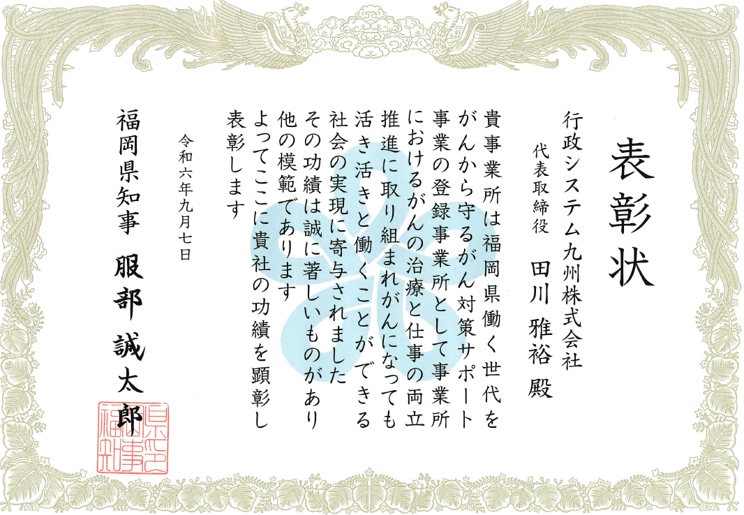このたび、治療と仕事の両立推進の取り組みが認められ、数ある参加企業の中から県知事表彰を受けることができました。
